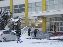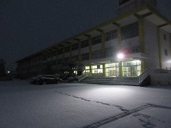 明日の始業は、通学路の積雪状況を踏まえ、余裕をもって登校できるよう1時間遅らせて9時30分からとし、授業は2限目からとします。終業の時間は変更ありません。なお、明日7時の時点で、大雪警報が継続中であれば休校となります。また、今後の降雪状況によってはさらに始業時間の変更や臨時休校への変更もありますが、変更の場合のみ明日7時の時点でお知らせします。