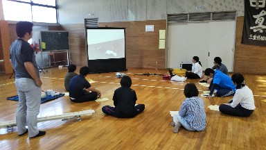 今日の放課後、職員で救急法の研修会をしました。研修会の内容は、①熱中症について、②担架について、③AEDについて、④心肺蘇生法&AEDの手順の確認と実技、でした。「熱中症について」では、教育委員会から配備された熱中症指数計の活用の仕方とそれによる学校での対応の確認をしました。「担架について」では、実際に担架を使っての実技も入れて担架の搬送法の確認をしました。AEDについては、まず映像で使用手順の確認をした後、3つのグループに分かれて実技演習をしました。AEDについては、毎年、実技演習をしているので、多くの職員がAEDの使い方などには慣れてきている様子がみられました。学校では、とっさのときに職員が実際にAEDが活用できるよう、こういった研修会を重ねています。