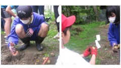 中学生がアドバイスをしながら、いもを傷つけないように掘りすすめます。