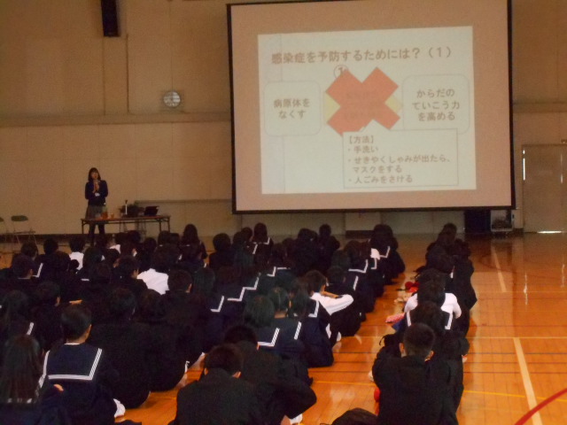 11月19日(木)、1年生は5限目、2・3年生は6限目に、四日市保健所の髙森さんを講師に性感染症についての出前講座を開いていただきました。普段、なかなか考えていない内容について、図や動画等も使いながら、わかりやすく説明していただきました。何事も正しい知識を身につけ、対応していけるようにすることが大切です。今日教えていただいたことを生活に活かしていきましょう。