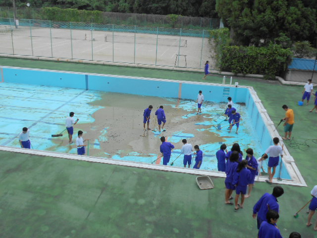 6月15日(水)、水泳の授業に向けて、プール清掃が始まりました。今日は、2年生が作業をしてくれました。1年経過すると、想像以上の砂や落ち葉が風で運ばれてたまっています。何事も、人の力を集めて取りかかれば、解決できます。作業は大変ですが、今年もぜひがんばってきれいにしましょう。もう、夏もすぐそこですね。