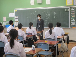 本日5限目、6限目2年生は職場体験に向けた事前学習の一環として名古屋から講師をお招きし、マナー講座を受けました。普段から行っている挨拶や身だしなみ、姿勢などについて丁寧に教わりました。保々地区で取り組まれている「保々地区18年間(社会へ)育ちのプログラム」では、つけたい力として「豊かな感性」「やり切る態度」「生き抜く基礎」という3つの力があります。今回の授業は「生き抜く基礎」につながっています。今、やっていることが将来へとつながっていくことを2年生の皆さんは実感できたのではないでしょうか。さあ、明日から素敵なあいさつで学校生活を送っていきましょう。