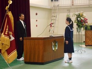 13:00より中央昇降口で学級発表があり、期待で胸を膨らませながら教室へと入っていきました。13:30より体育館で、保護者の方々に見守られながらA組の新入生から入場してきました。保々中では、3年生の歓迎の歌を新入生に送っており、今年も44名の3年生が参加してくれました。校長先生のあいさつのあと、新入生代表の村上花怜さんの誓いの言葉がありました。しっかりとした口調で、堂々と入学に際しての決意を述べてくれました。そのあと、3年生の合唱、「校歌」、「あすという日が」を贈りました。