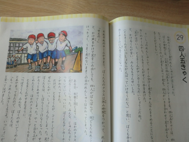 教材文の中で、主人公は、運動会に向けて4人5脚を練習しますが、うまくいきません。責任を感じる友だちは「みんな、ぼくのせいでごめんね」と謝りの言葉を。次の日に向けて、主人公、友だちそれぞれが起こした行動は‥