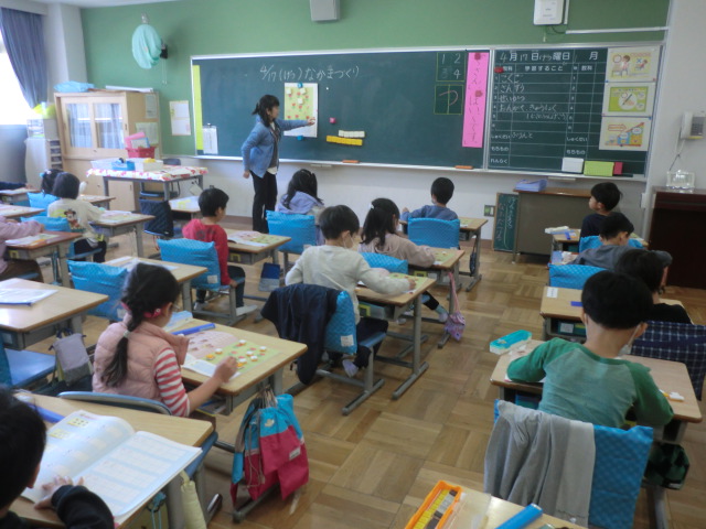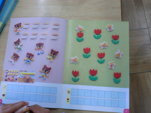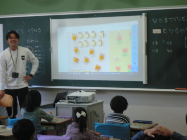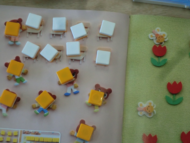 数字はまだ習っていないので、指で数える子も、目で追いかける子もいました。工夫して確かめようとしていました。そこで、みんなに伝えやすくするために、ブロックが登場。それぞれの場所に置いてみて、並べなおし、足りるかどうかわかりやすくする方法を確かめ合いました。キラキラした表情で、学びを進める1年生です。