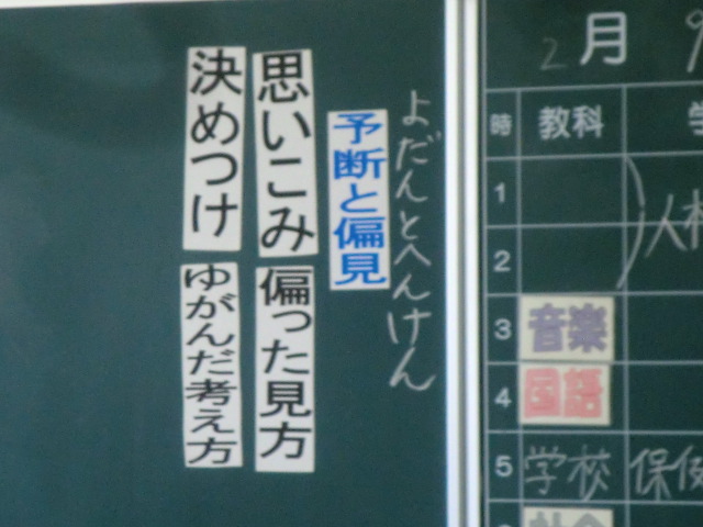 2年生、4年生に続き6年生での人権教室。 はじめに講師の方から、「2年生、4年生でも人権について一緒に考えた授業をしたことを覚えてる?」 ちらほら手が上がる中、「2年生の時は、男の子と女の子のことで、これだれの?‥」とヒントを出すと、そういえばと多くの子が思い出す表情に。「4年生の時は、いじめについて」と、記憶がつながっていきます。 人権教室は断続的に行うことで、少しずつ人権を大切にする感覚を育むことも狙いとしています。 6年生でのテーマは「予断と偏見」。授業導入時に、手や腕の組み方、図形の描き方や見方、色や図形の見え方、「肌色」と永く呼ばれていた色の決めつけ等、身近にある「予断と偏見」について考えあいました。 メインはアニメ「桃色のクレヨン」視聴を受けての話し合い。 あらすじ‥いとこの雪が8年ぶりに外国から帰ってくることを知らされた美奈子は、英語を教えてもらいたい、一緒にいろんなことをして遊びたい・・と、期待で胸がふくらむ。美奈子は、雪のことを学校で一番仲良しの沙希や夏子にも自慢する。ところが、美奈子の前に現れた雪は自分が想像していたよりも幼く見えた。雪には知的障害があったのである。とまどった美奈子は、そのことをかくすためにみんなにウソをついてしまう。そのウソがばれて、美奈子は、クラスで仲間はずれにされてしまう。そんな中、雪のやさしさにふれることで、美奈子は様々なことに気付かされるようになる。 主人公の「予断と偏見」と自分自身を重ね、思いを深め合う6年生の姿がありました。