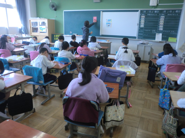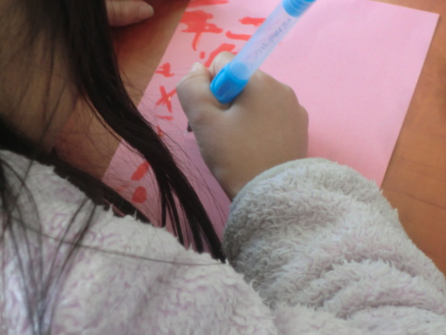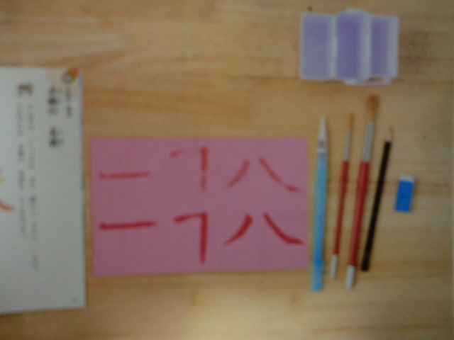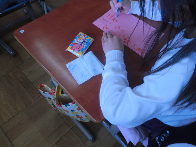 この紙は「水書用紙」といって水にぬれた箇所だけ、赤くなり乾くと消える特別な紙です。ここに「水嶼ペン」(毛筆で使う筆に似たもので、先端に水が染み出てくるペン)で、一生懸命字の練習。さながら3年生から始まる毛筆練習です。しかし、失敗しても大丈夫。乾けば元通り。何度でも書き直して練習。いつも以上に丁寧に字を書く2年生です。