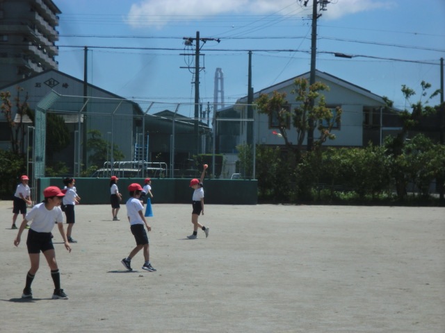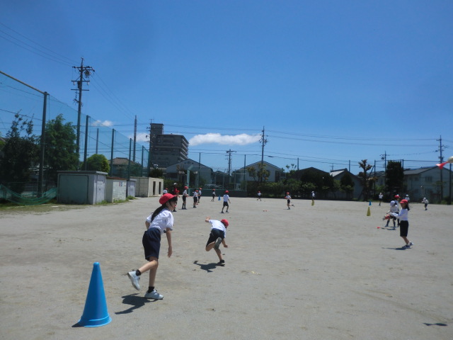 5年生が、元気に体育。「投げる」運動に取り組んでいました。