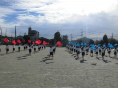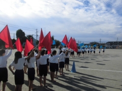 今年の5年生は、旗を使った表現に組体操の一人技を取り入れました。