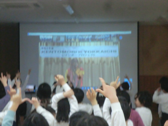 大画面上にKennto Moriさんが登場するとそのいでたちに「お~!」と感嘆の声。リズムよい語りに乗せられて、子どもたちは自然と振付を覚えていきます。多少ずれていたり間違っていたりしても、気にする子はいません。みんなニコニコしながら笑顔でダンス。たくさんの運動量がありましたが、楽しさをそれ以上に感じている1・2年生です。