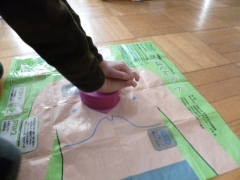心肺蘇生トレーニングキットを使って、まずは胸骨圧迫について学びました。