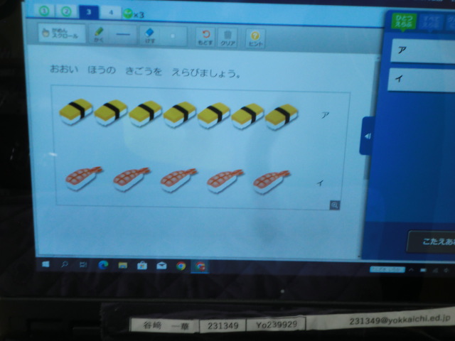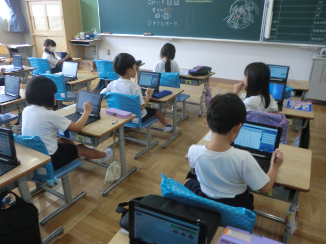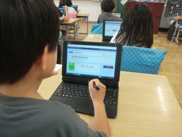 1年生が、タブレットを使って、国語や算数のドリル学習。