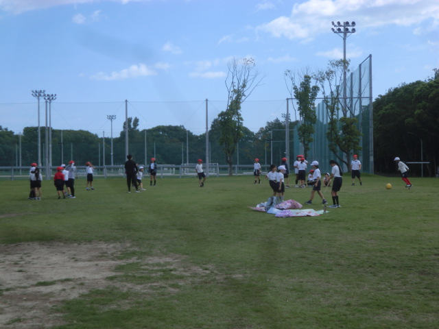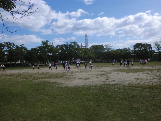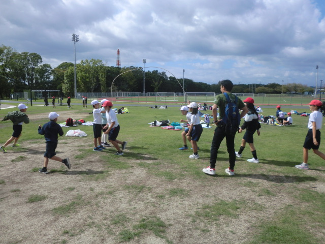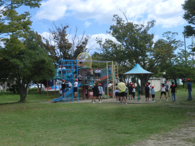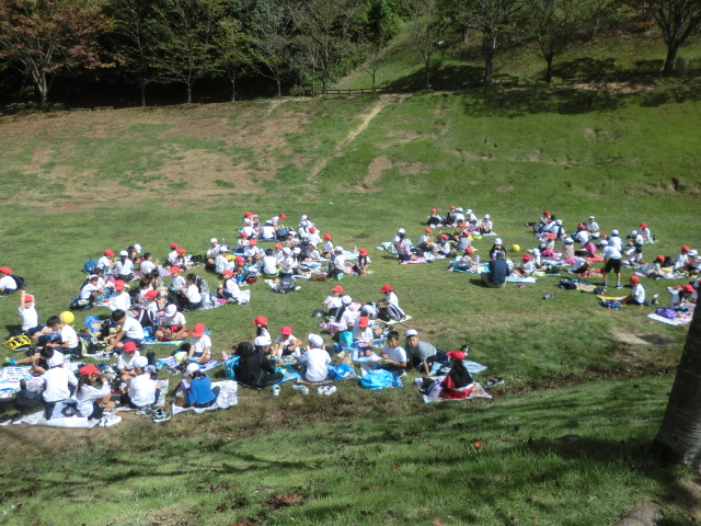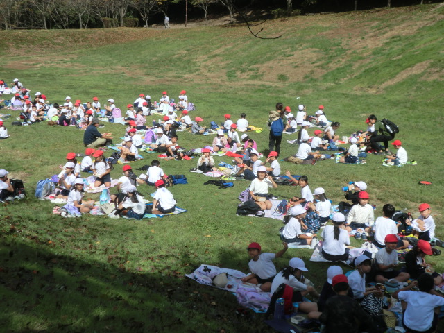 それぞれの芝生広場に到着。なんと十二分のスペースを貸し切り状態で使用することができました。先月までの猛暑を忘れさせてくれる気候の中、異学年交流と共にお弁当を笑顔で味わいました。