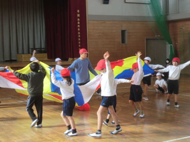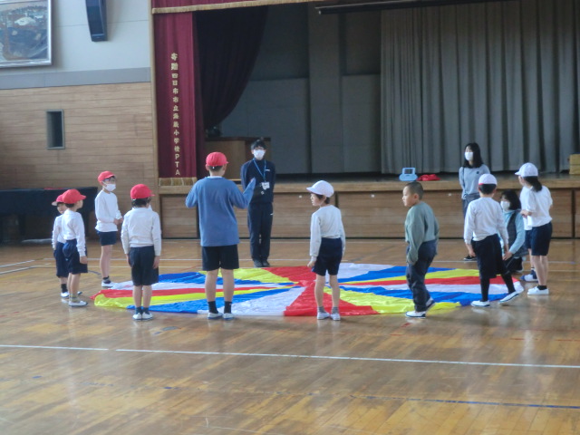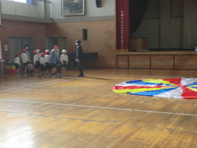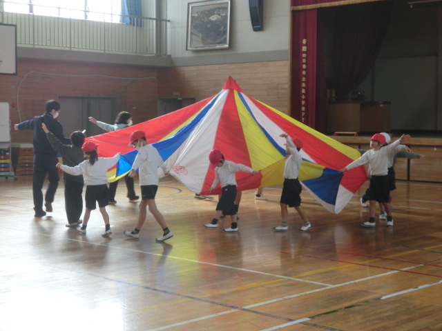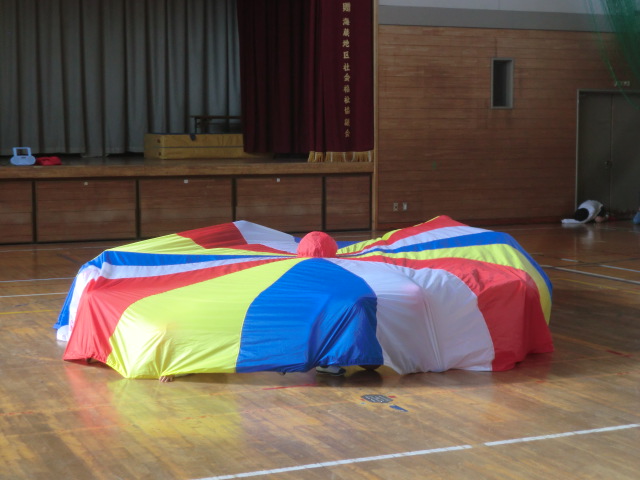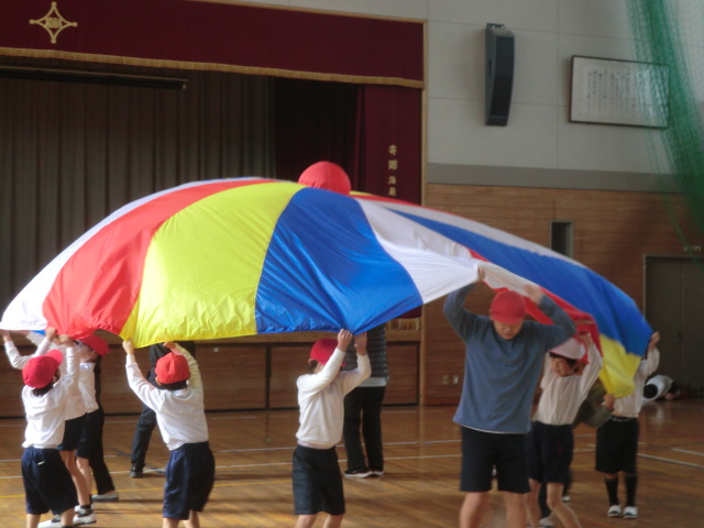 「小波」「大波」「おせんべい」「かくれんぼ」「トルネード「あさがお」等の合言葉とテンポに合わせ、パラバルーンに空気を送り込み、様々な形に変化させていきます。