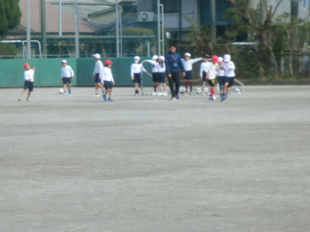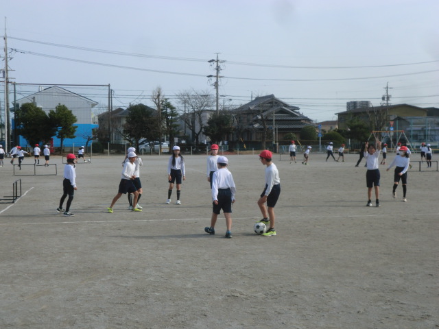シュートやパスやドリブル練習。手のようには扱えず、慣れていない子どもたちも、チャレンジ精神でキック!狙ったところに蹴ることができると思わず笑顔に!最後はゲーム。気温が20度を少し超える暖かな日となり、楽しそうにボールを追いかける3年生4年生です。