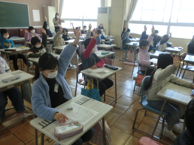 「㋐から㋑に変わったと思ったら手を挙げて」の指示には、多くの子が聞き漏らさずに、曲の特徴をとらえて挙手することができていました。