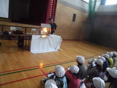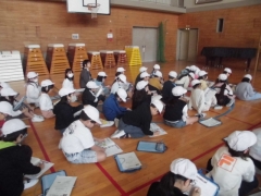 まずは全体で消防の仕事や市内の火災状況、実際に火事が起こった時の行動に関わる講話を通して学習しました。