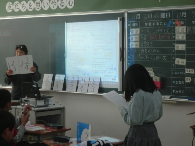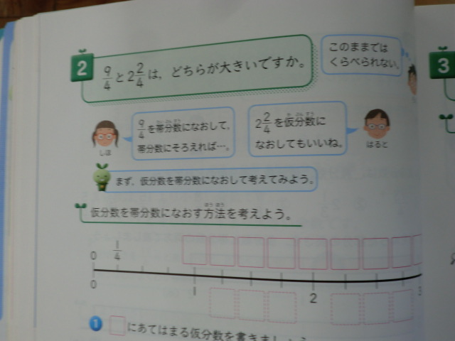 今回は、仮分数を帯分数に直す方法を考える時間。まずは、前時に学んだ「仮分数」「帯分数」の意味を確認。