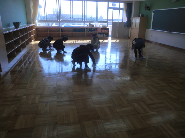 5年生が、来週の卒業式のため、そして4月からのが学校生活のために、ワックスがけを行いました。1年生から6年生までの教室に分かれて、丁寧に手作業。もちろん手荒れを防ぐためにビニール手袋を着用。床面が光を反射してキラキラと輝くと、5年生も満足と充実感あふれる表情。学校生活の中で、学年の終わりに、教室環境を整え、区切りをつけながら新年度に向かっていきます。