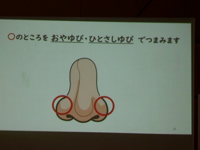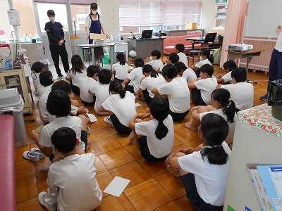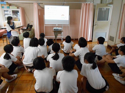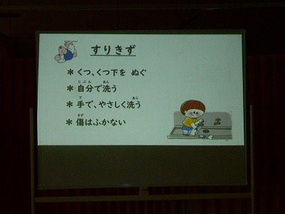 今日は、久しぶりの雨ですが、連日まだまだ暑いですね。こんなに暑くても、子どもたちは元気いっぱい!思わずこけてけがをすることもあります。そこで、今回の保健指導では、けがをしたら、まず水道水で傷口の砂を洗い流してから保健室へ来校することや、鼻血が出てしまったら鼻のどの部分をおさえたら良いかといったことなど、クイズを交えながら子どもたちに伝えました。自分の身を自分で守れるよう、一つずつ成長につなげていきます。