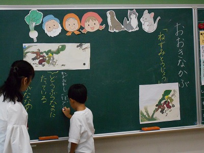 1年生では、国語「おおきなかぶ」の学習がクライマックスに入ってきました。なかなか抜けなかったかぶが、やっと抜けた場面です。