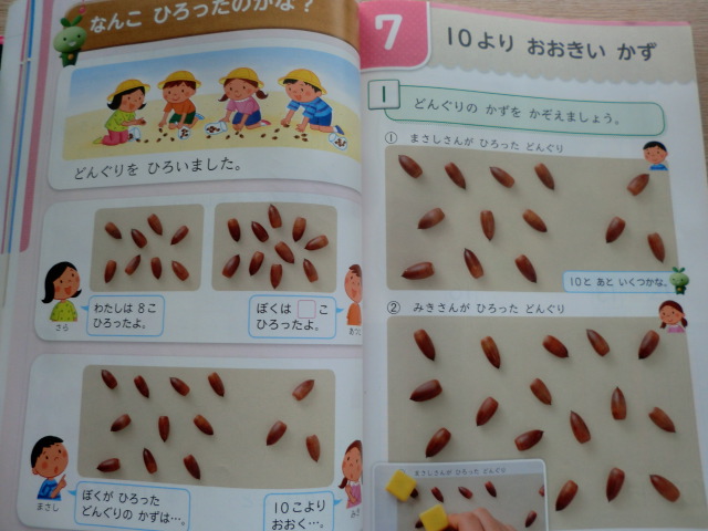 しかし、1年生の教科書には、ランダムに置かれたどんぐりの写真が。あきらかに10よりは多そうです。