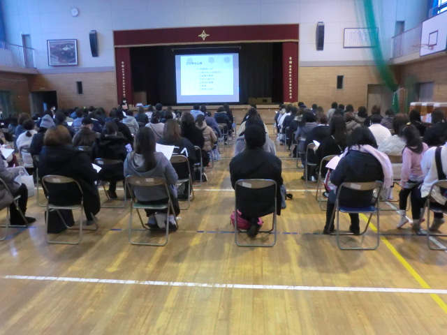 1年生担任、養護教諭、主幹教諭より、入学心得や健康管理、学校との連絡ツール「ホーム&スクール」登録方法などを説明させていただきました。そして学用品販売の時間を取り、入学準備を保護者の方に進めていただきます。