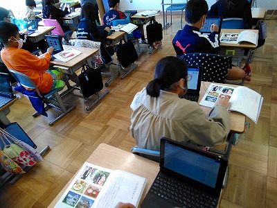 今日参観した授業について書きます。4年生国語では、身近な暮らしの中から和と洋を探す活動を行っていました。自分の生活や経験をもとに考え、タブレット上に「畳」に対して「カーペット」など、思いついたものを書き込んでいました。