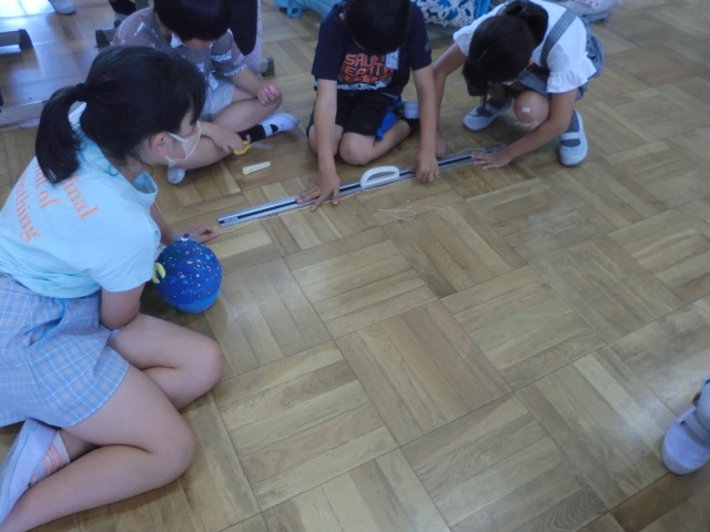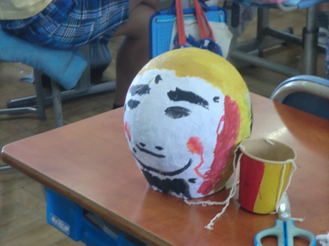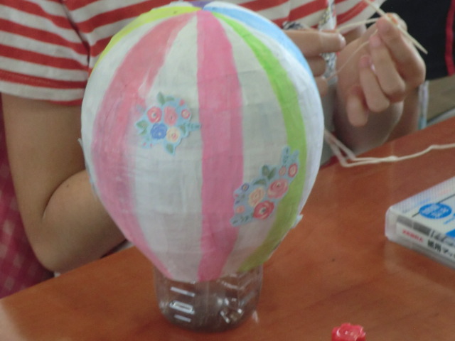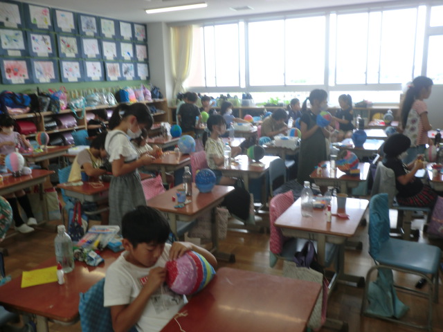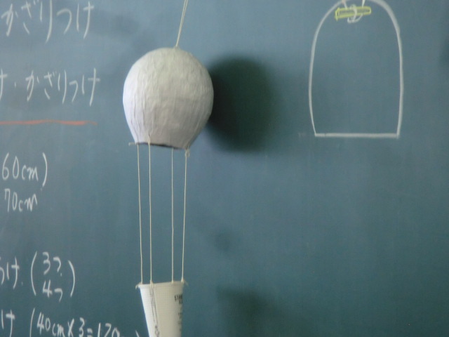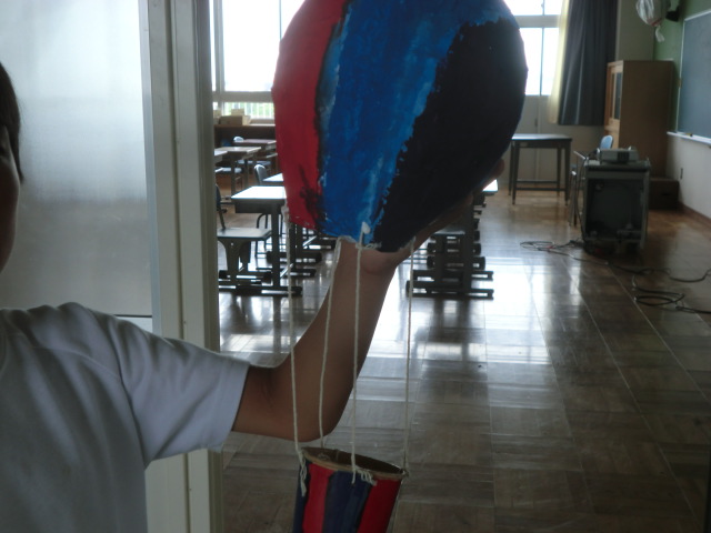 風船に紙を張り、乾かし、気球の型が出来上がってきましたので、着色や装飾を施し、完成をめざして4年生が頑張っていました。