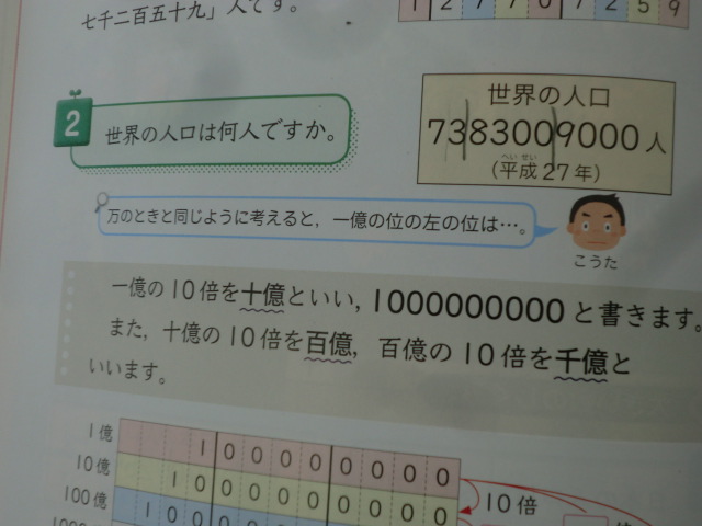 4年生算数、大きい数の仕組みの学習。教科書には、平成27年度7383009000人と記されていますが、読めるでしょうか?