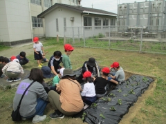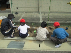 つくし学級では、2時間目のつくしタイムに、夏野菜とさつまいもの苗植えをしました。
