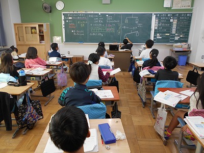 今日のめあては「みんなが、同じ重さを同じ数で表すには、どのようにすればよいでしょうか」です。ものの重さをはかる時に、天びんのような道具を使ってどちらが重いかを比べたりします。初めは、物と物を天びんのような道具を使って、比べました。次に、「もとにするおもさ」を決めて、それと重さを比べることで学習が進んでいきます。