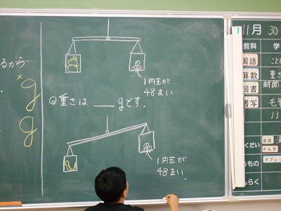 でも、教室に入ると、何やら盛り上がっています。黒板を見ると、一円玉48枚と比べているものが…、なんと「雪だるま」。そして、もう一つは「へび」。楽しく重さの学習に取り組みました。