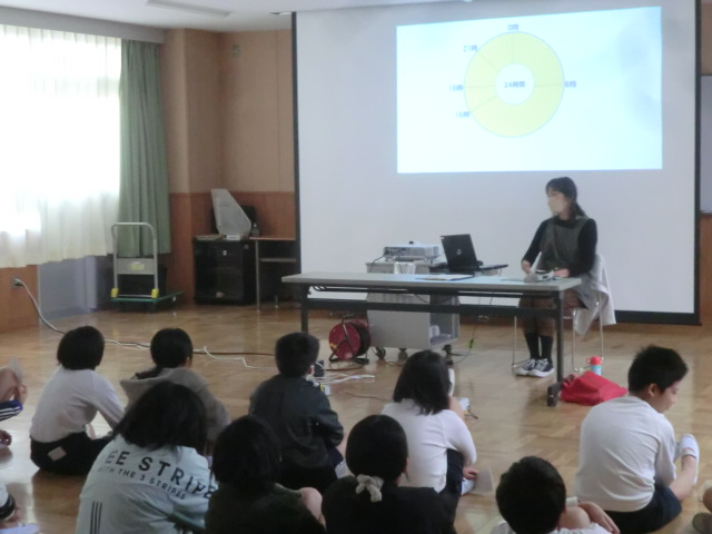 学期はじめの発育測定と共に、養護教諭から保健指導が行われています。毎回テーマを変えながら、子どもたち自身が健康管理の意識を高められるよう考える時間を確保しています。