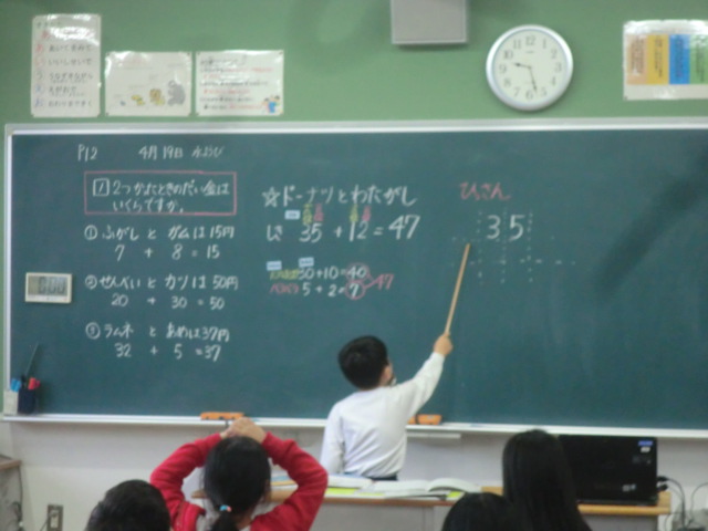 足し算にすることは気づいた2年生。では、2桁の数の足し算はどのようにしたらよいのでしょうか?
