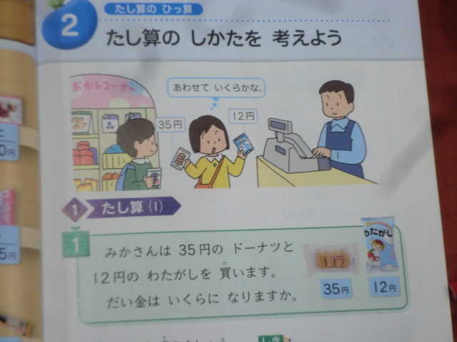 「みかさんは 35円の ドーナツと、12円の わたがしを買います。代金は いくらになりますか?」