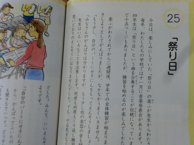 あらすじ‥ある学校の4年生、音楽発表会に向けて合奏曲「祭り日」を練習中。しかし、思い通り練習の成果が発揮できないことに悩んでいました。先生から「もう少し、自分のパートに責任をもって演奏しましょう」「みなさんの頑張りはわかりますが、もう少し他の楽器の音も聞きましょう」とアドバイスが。そして「一人一人が、頑張って音を出せばいいというわけではないのかな?」と考え始めます‥