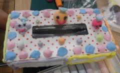 カラフルねん土でかざりをつくり、それを材料に付けます。