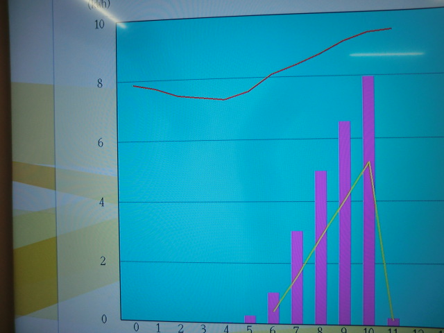 写真では、ピンク色の柱状グラフが発電量、黒色の折れ線グラフが気温を、黄色の折れ線グラフが日射量を表しています。