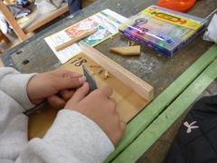 今日は4年生が小刀を使って木を削る学習を行いました。
