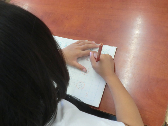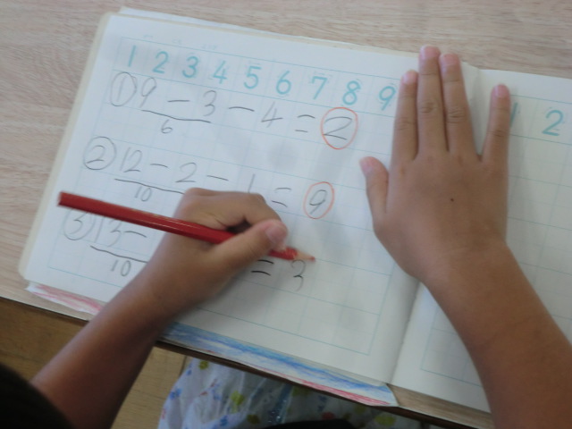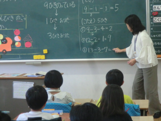 たくさんのつぶやきが聞こえてきます。絵でイメージして、式に表す1年生。丸を付けてニッコリしていました。