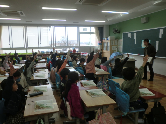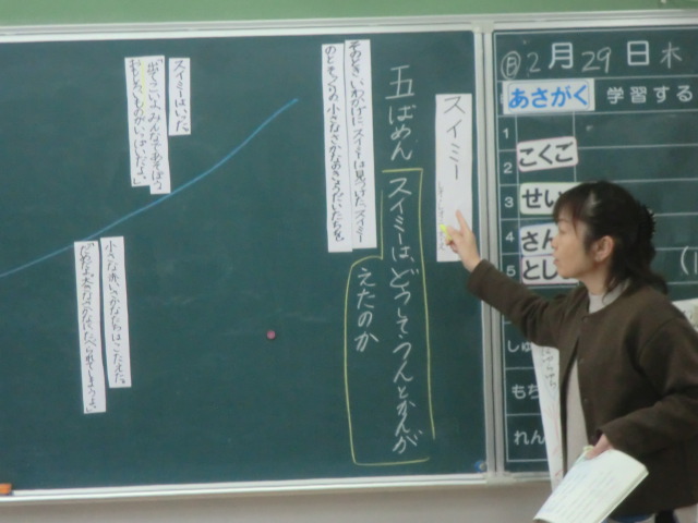スイミーの気持ちに寄り添えるよう、教科書を読み返し、一生懸命考える1年生の姿はスイミーのようでもありました。