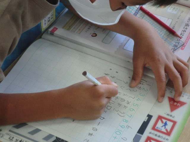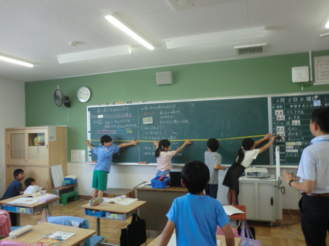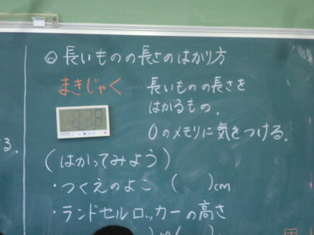 黒板の横の長さをはじめ、教室の中のものを、たくさん図って記録。算数でも、実際に体験して生活と数字を結びつけることを感覚として身に着けることは大切です。