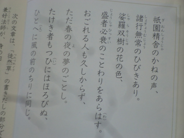 「祇園精舎のかねの声、諸行無常の響きあり。沙羅双樹の花の色、盛者必衰の断りをあらはす。おごれる人も久しからず、ただ春の夜の夢のごとし。‥」
