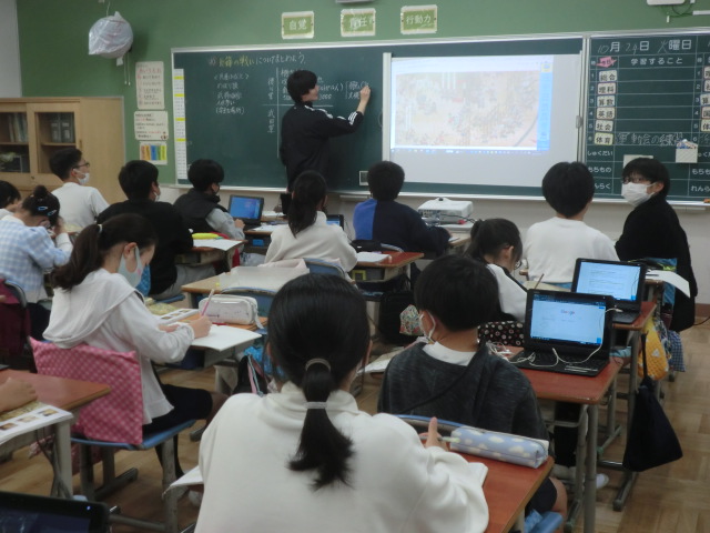 各自関連したことを調べ、発表し合い歴史背景を学び合っていました。キーワードとして「鉄砲」「三段撃ち」「騎馬隊」「織田信長」「徳川家康」「豊臣秀吉」「武田勝頼」等々が出されていました。