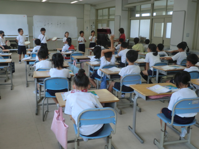 普段耳にする音楽は4拍子が多いので、このリズムは子どもたちにとって新鮮に感じられたようです。音楽を笑顔で楽しむことができていた2年生です。