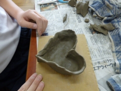 円や四角やハートなどの土台の形の上に順にひも状の粘土を重ねてつなぎあわせ、形を整えながらオリジナル器をつくりあげました。