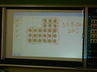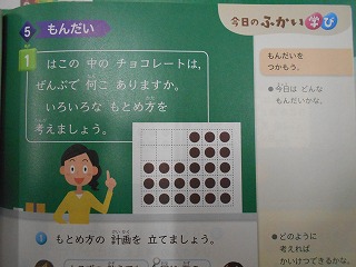 2年生では、学習したかけ算の九九をつかって、“ふかい学び”に挑戦していました。問題は「はこの中のチョコレートは、ぜんぶで何こありますか。いろいろなもとめ方をかんがえましょう」です。