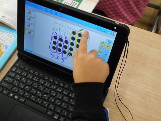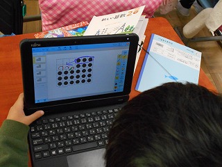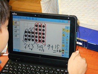 ドットのような●が並んだ図をタブレット端末を使い、絵や図や式をに表しながら考えていきます。答えはいつも「1つ」です。でも、本当にいろいろな考え方を子どもたちは考え出してきます。「こうすれば楽じゃん!」「えっと、まだやり方があるよな」…など、つぶやきが聞えてきます。この、いろいろな考えの多様性を学級で話し合うことで、「あー、なるほど」「そんなふうにもできるんだ」「すごいなあ」と互いに認め合う場面にもつながります。そこが、算数の学びとして一番面白いところですね。子どもたちの考えの一部を紹介します。
