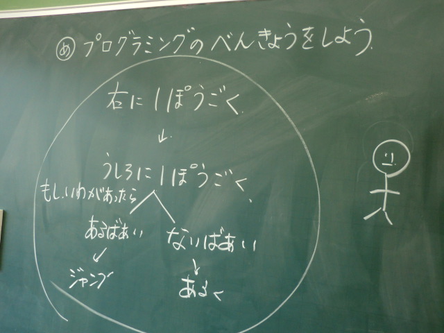 画面上のキャラクターに、「歩く」「ジャンプ」「前」「後ろ」「右」「左」「斜め」等の指示をプログラミングし、目的地まで移動させるというゲーム感覚の学習です。